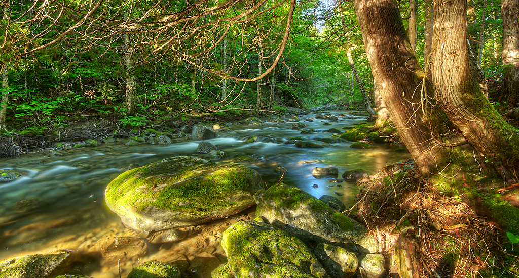 Rivière verte, au nord de Maria en Gaspésie, au lever du jour. Composée de 9 images superposées, réalisées avec le Nikon D3S et le AF-S 16-35mm f/4G VR et un filtre polarisant.