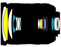 Donc, comme les deux lentilles semblent sorties du même moule, elles partagent également le même type de boîte (elle est pratiquement pareille, mis à part sa longueur plus grande). Inclus dans l'emballage, les deux capuchons d'extrémité, un pare-soleil au look tulipe très élancé (le modèle HD-35) et un étui de remisage de tissus feutré noir à cordons (modèle CL-1018). Les papiers de garantie et les instructions sont également dans cette boîte dorée. Sa constitution est légèrement plus élaboré que les zooms et lentilles moyens. Il est constitué de 16 éléments joints en 12 groupes, incluant 2 verres de type "ED" (représenté en jaune ci-dessous), 3 verres asphériques (en bleu pâle cu-dessous) et l'intérêt majeur de cette lentille, son groupe de verres anti-vibration, constitué d'un élément normal et d'un verre asphérique (représenté encadré en violet ci-dessous):