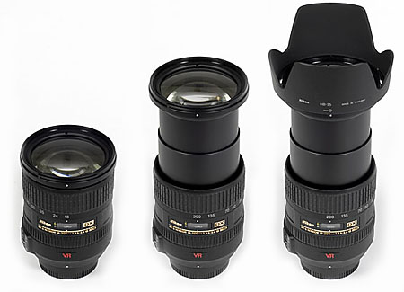 Ici, aucune surprise: la lentille est de la même facture que sa petite soeur, la 18-70mm. Donc, si vous avez vu cette dernière, c'est la même chose pratiquement, c'est-à-dire un bâtit de plastique rigide, et fini moucheté. Encore une fois, ce fini nous laisse un peu hésiter à savoir s'il s'agit bien de plastique, ou d'un quelconque matériau composite plus avancé technologiquement parlant. Mais c'est bien du plastique. C'est une Nikon, sans nul doute, et du "nouveau" Nikon. Et puis, celle-ci a son poid. Elle "pèse" passablement plus que sa petite soeur, la 18-70mm. Elle est aussi un peu plus encombrante, quand par exemple on porte le boîter au cou, comme je le fais souvent quand je suis en promenade en forêt ou en marche urbaine. Mais rien de bien catastrophique, et on s'y habitue assez rapidement, mais au début, on note rapidement la différence! Mais que sommes-nous pas prêt à tolérer pour s'offrir la différence de plage focale, et l'anti-vibration??? La longueur de la lentille à l'état "grand angle" (18mm) est assez compacte (à peine plus longue que la 18-70mm), mais à son maximum télé-photo (200mm), ayayaye, ça fait pratiquement du vent quand on change de direction!! Ça donne un méchant grand tube d'extension. Voici une image qui donne une idée de la différence entre l'état "grand angle" et l'état "télé-photo" (la troisème image est également à pleine extension, mais avec le pare-soleil...):