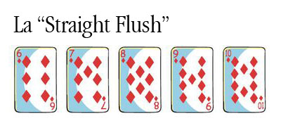 La "Straight Flush" - ou "Suite de couleur" - est constituée d'une suite de même couleur, tout comme la "Royal Flush", à ceci de différent que la plus haute carte de la suite n'est pas constituée d'un As (l'As peut faire partie de la suite, mais est à la position "1", ou juste devant le "2").