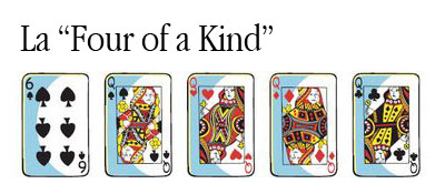 La "Four of a Kind" - ou "Quatuor" - est formée de quatre cartes de même rang et de couleur différente (forcément!). Dans cet exemple-ci, la main est composée de quatre Reines (Q). Tout comme le reste des mains au Poker, si deux joueurs ont une "Four of a Kind", la plus élevée des deux mains remporte. Si la valeur est identique pour les deux joueurs, la carte restante (appelée la carte "kicker") départage alors la main gagnante.