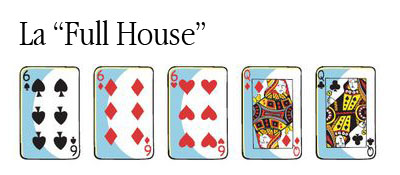 La "Full House" - ou tout simplement appelée "Full" - est constituée d'un trio (trois cartes d'identiques valeurs) et d'une paire (deux cartes d'identiques valeurs). Dans l'exemple ci-haut, la main est constituée d'un trio de "6" et d'une paire de "Reines" (Q).