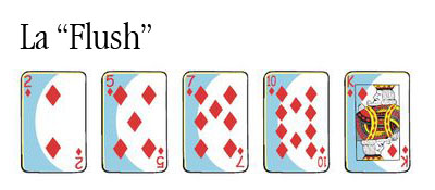 La "Flush" est une main qui n'a aucune suite, ou pairage, mais dont les cartes sont toutes de la même couleur (dans l'exemple ci-dessus, nous avons une "flush" de Carreaux).