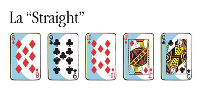La main de type "Straight", contrairement à la "Flush", est seulement composée d'une suite ordonnée en séquence, mais dont les cartes ne sont pas de la même couleur.