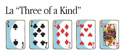 La "Three of a Kind" - aussi appelée "Trio" ou "Tripple" - comme son nom l'indique, consiste à retrouver trois cartes de rang identique dans sa main, peu importe la couleur. Cette main cause quelques fois d'agréables surprises... Dans notre exemple ci-haut, la "three of a kind" est composée de trois cartes de valeur "7".