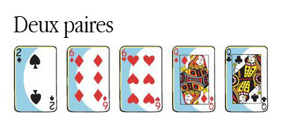 La "Deux paires" est constituée, comme son nom l'indique, de deux paires. Ici aussi la carte restant seule dans la main est appelée la carte "kicker"; dans le cas où deux joueurs auraient 2 paires identiques, c'est la 5ème carte, la carte "kicker", qui départage le gagnant du perdant.