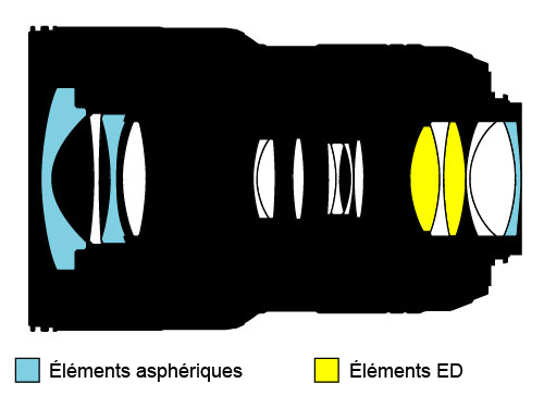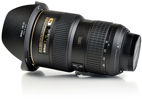 Comparé à d'autres zooms de calibre pro, le AF-S 16-35mm f/4G VR vient dans une boîte plutôt efflanquée, haute et mince. Le zoom vient équipé du pare-soleil tout simplet HB-23, qui est le même qui équipe les AF-S DX 12-24mm f/4G, AF-S 10-24mm f/3.5-4.5G, et (si je ne me trompe pas) AF-S 17-35mm f/2.8G ED (et probablement plusieurs autres zooms grands-angles chez Nikon, comme le AF 18-35mm, etc.). Un étui en (simili) suède flexible CL-1120. Encore ici, ça vient avec les habituels papiers de garantie et un sympathique petit livret du propriétaire. Pas de bague des ouvertures encore ici - ce qui est maintenant le standard, il est assez effilé lui aussi (tout comme sa boîte) et a une forme qui s'apparente légèrement à celle du AF-S 24-70mm f/2.8G ED. Cet ultra grand-angle pour le format FX est composé de 17 éléments joints en 12 groupes, incluant deux éléments ED, trois éléments asphériques et un élément avec revêtement Nano Crystal: